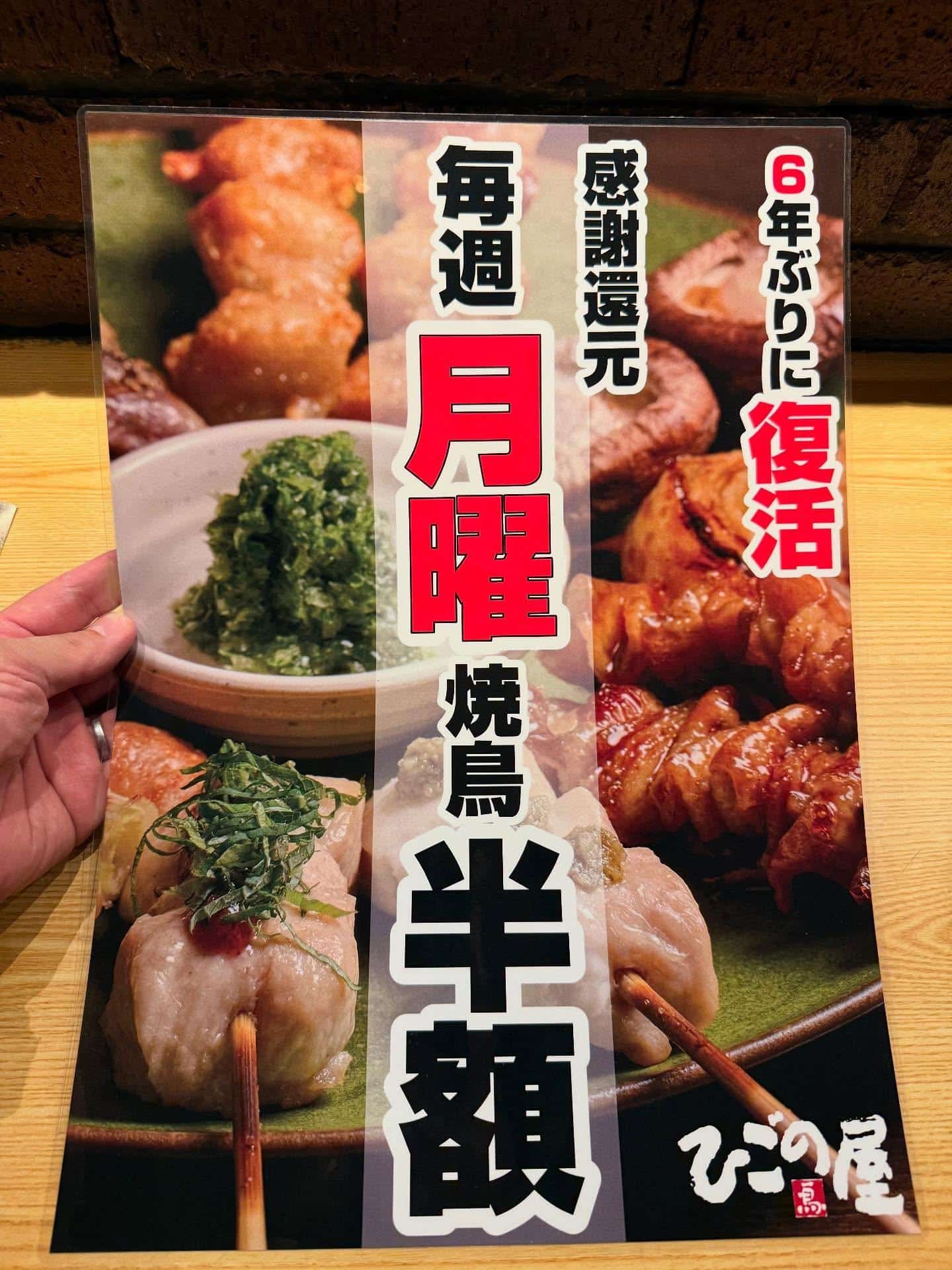 本日2025.09.01より、『毎週月曜日焼き鳥半額感謝デー』が6年ぶりに復活致します!