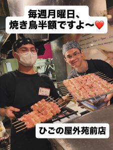 ひごの屋は、全店で『毎週月曜日焼き鳥半額デー』です。